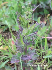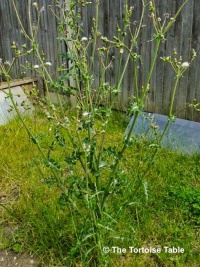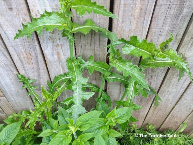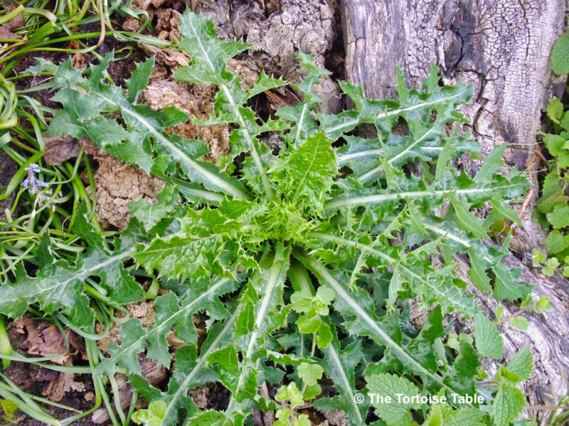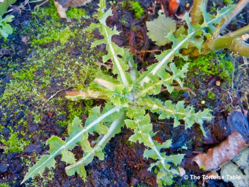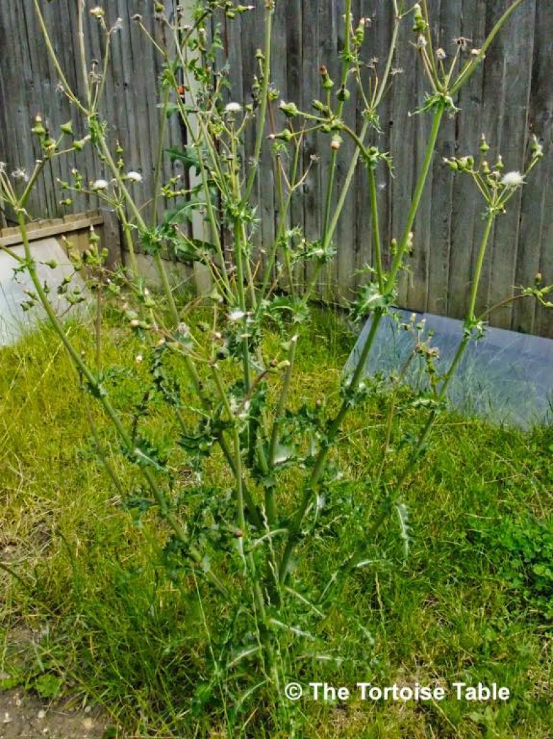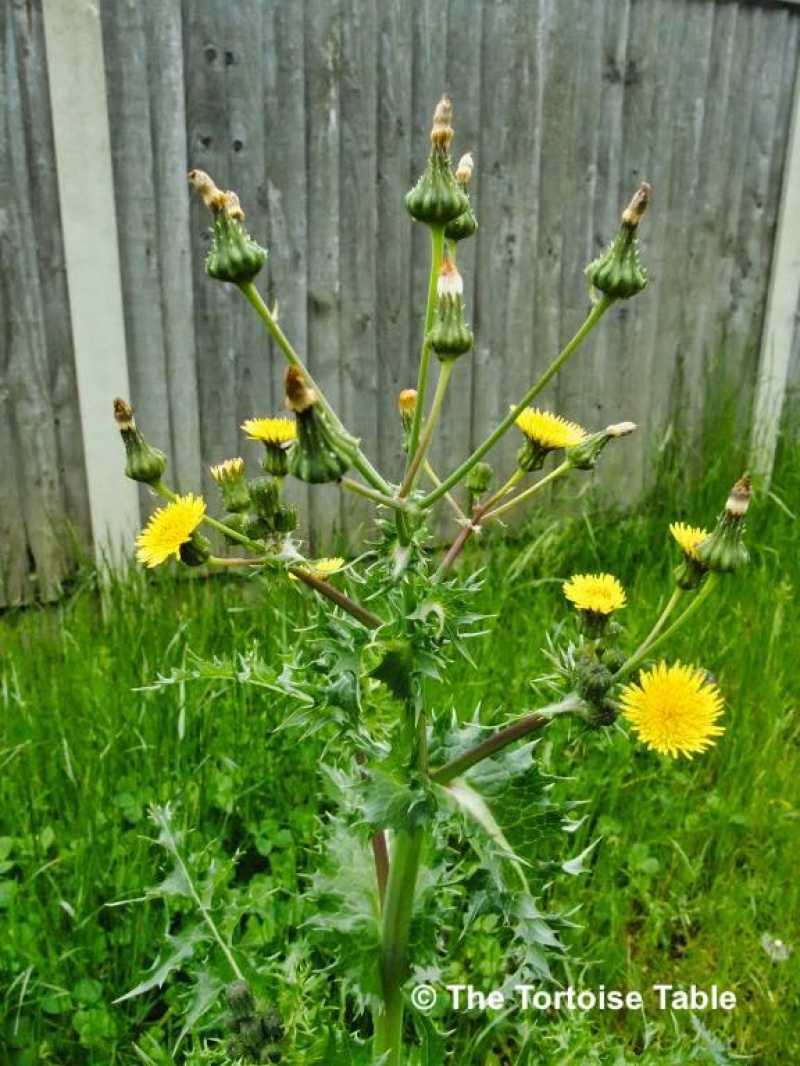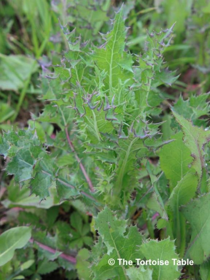There are 130 species of Sow Thistle (Sowthistle), some with spiny leaves and some with smooth leaves. All can readily readily soak up nitrates from the soil, and in large quantities nitrates may reduce the oxygen carrying capacity of the blood. If the Sow Thistles are growing on nitrogen-rich soil (e.g. soil that has had chemical fertilisers added, or rich potting compost) then feed in small quantities only, but if grown on poor soil then they are safe to feed. See also Sow Thistle (Smooth).