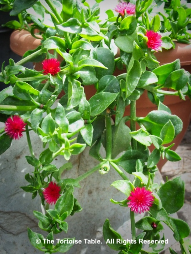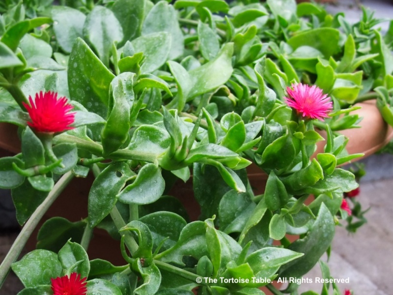 This lovely low-growing succulent would be fine to add to the tortoise enclosure or grown in a pot on the ground for a snack when it grows within reach of your tortoise. It also looks good in a hanging basket in full sun in summer. Grown with some protection during the winter it will provide extra variety after hibernation. Flowers are usually red (which fades to pink with age), but they can also be found in purple, yellow and white.
